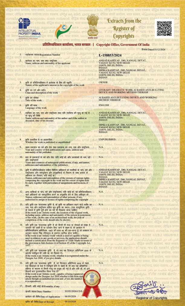 An AI-powered anti-bullying device that analyses speech sentiment to detect distress and alert trained authorities.