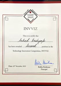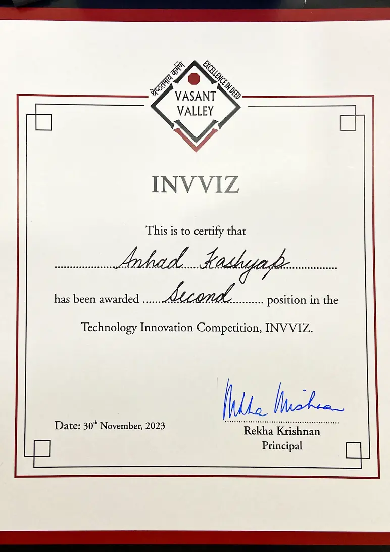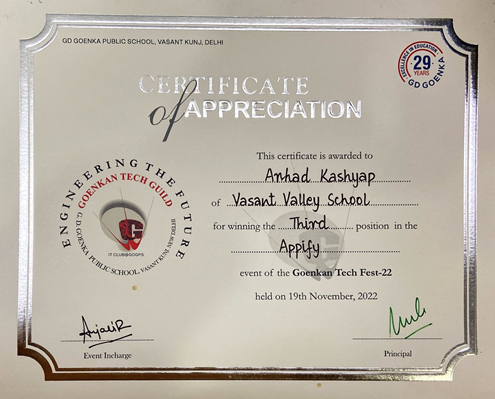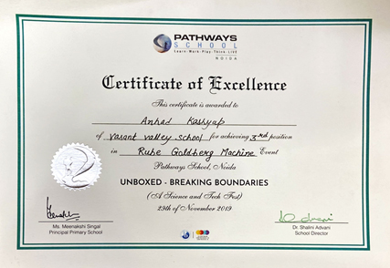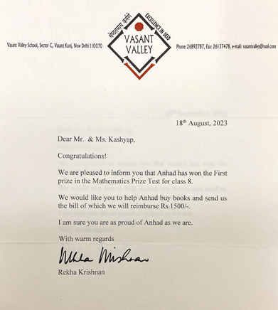1st position holder in every Maths Prize Test since Grade 3 at Vasant Valley School, New Delhi