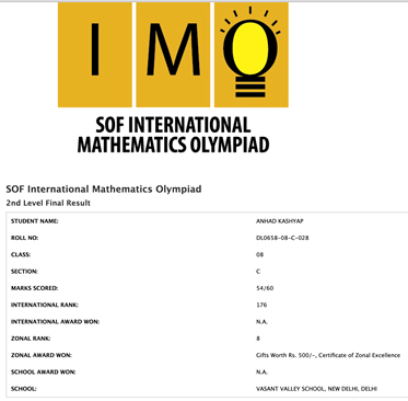 Inter School Sigma Mathematics Competition 2025 Science Olympic Federation (SOF) - IMO International and National rank holder every year since Grade 3